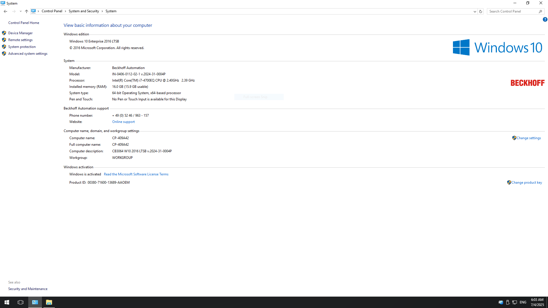 - installed Beckhoff Windows 10 LTSB 2016 and digitally activated online + Deployment Images